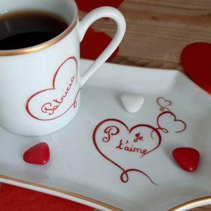 Une porcelaine fine fabriquée et décorée en France pour sublimer ce symbole universel. Nous vous proposons des formes et des décors sur le thème Mon Cœur, Mon amour. Avec des motifs rouge passion et or fin, chacune de nos porcelaines peut être personnalisée à votre convenance.