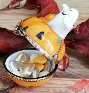 A L’ Atelier Porcelaine, nous avons décliné notre collection Halloween sur quelques modèles de petites boites citrouille. En version orange et doré, surmontée d’un petit fantôme ou travaillée avec un décor à la plume en noir et doré.